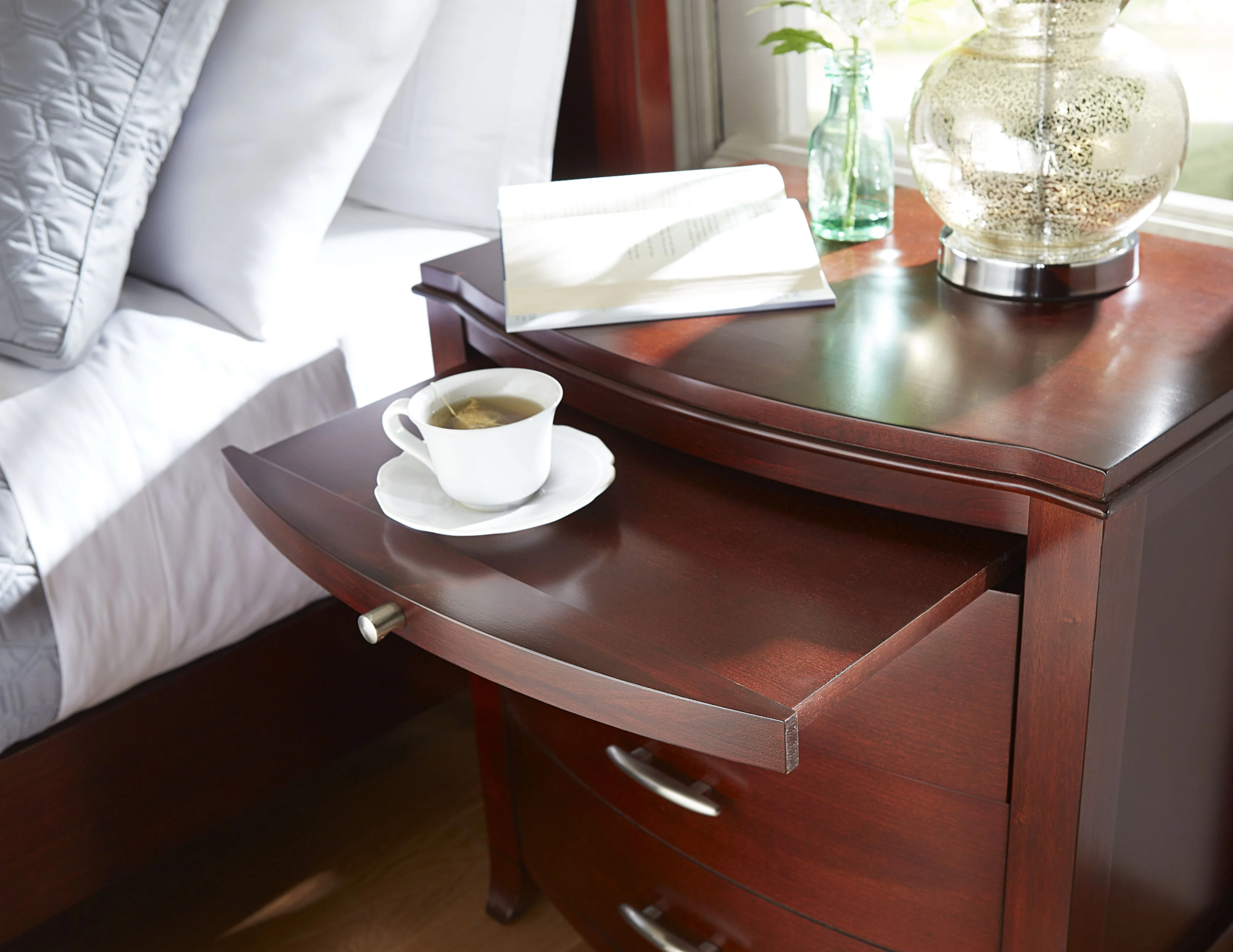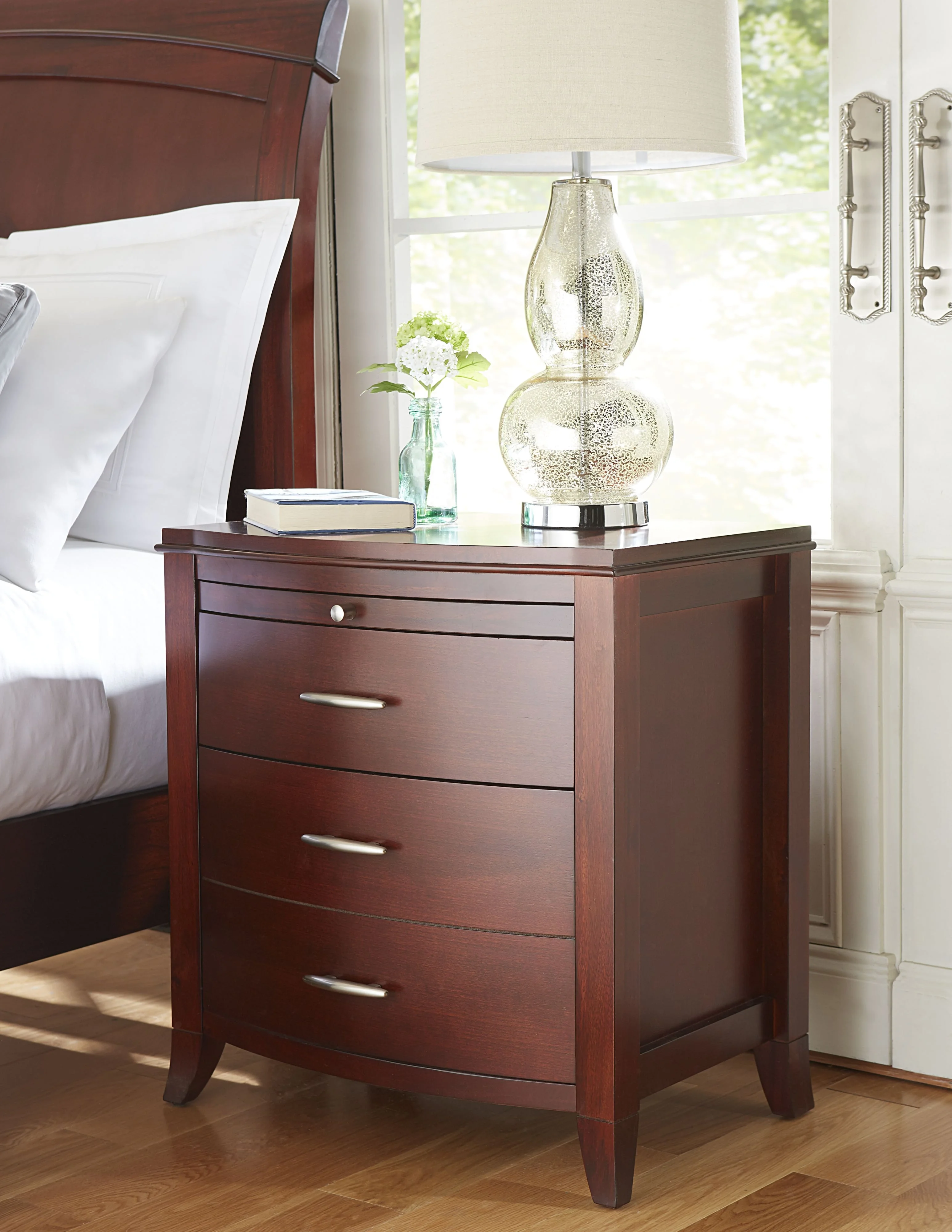 Sanded & stained solid wood drawer boxes with dovetail joinery, Drawer boxes and wood frames are corner blocked to ensure rigidity and lasting quality, Space saving pull-out tray is a great place to rest a cup of coffee, Package includes 1 Brighton Two Drawer Nightstand in Cinnamon, Full extension ball bearing drawer glides, Constructed from Tropical Mahogany solid wood, Cherry wood veneer, Built-in power outlets inside the drawer for convenient gadgets charging, Bentwood fronts give the piece a soft, distinguished shape, Satin Nickel drawer pulls add a contemporary touch