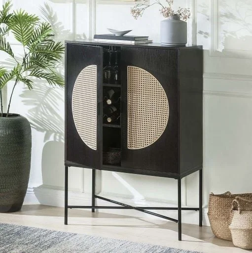• Wooden Cabinet & Metal Legs • Cup Holder & Wine Rack Included • Rattan Insert