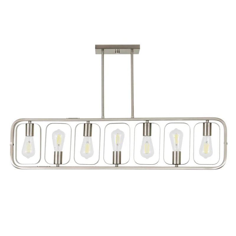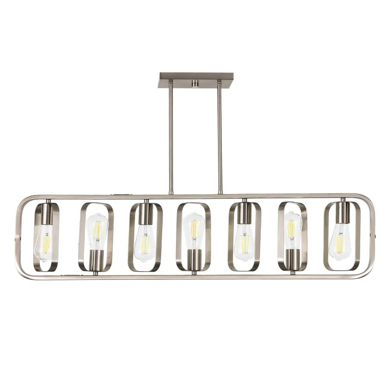 Set of rods are included to customize the height up to 80 in. tall, Requires 7 incandescent medium base E26 bulb, which are not included, Modern island chandelier in polish nickel finish