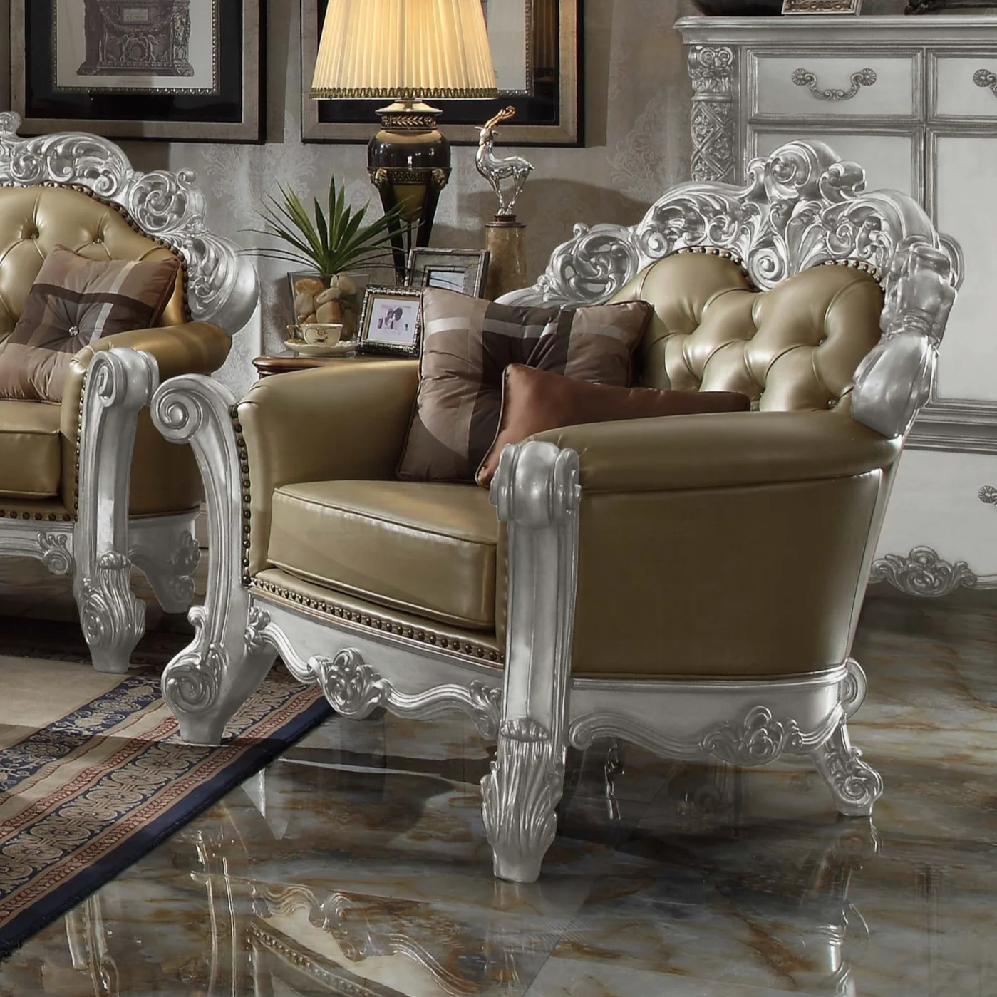moreTracing back to the classical Baroque era, expressed with intent and conviction, our new interpretation is donned. This traditional tufted chair is grand and classy with crystal like button tufting on the back in a silver patina finish richly accented with leaf brushed onto each piece by hand. The carved frame decor and nailhead trim around the crown, arm, and base accentuate style and class. Two pillows are included for additional comfort and support.